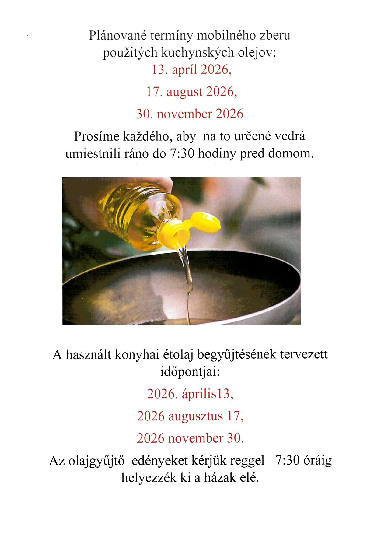 Használt konyhai étolaj begyűjtésének tervezett időpontjai 2026-os évben